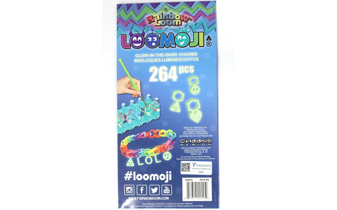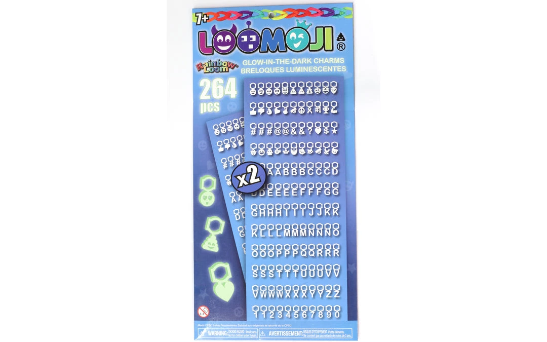 Compatible with Loomoji® only. Contains 2 sheets for a total of 264 pieces of glow in the dark charms. Recharges with sun or fluorescent lamp exposure.